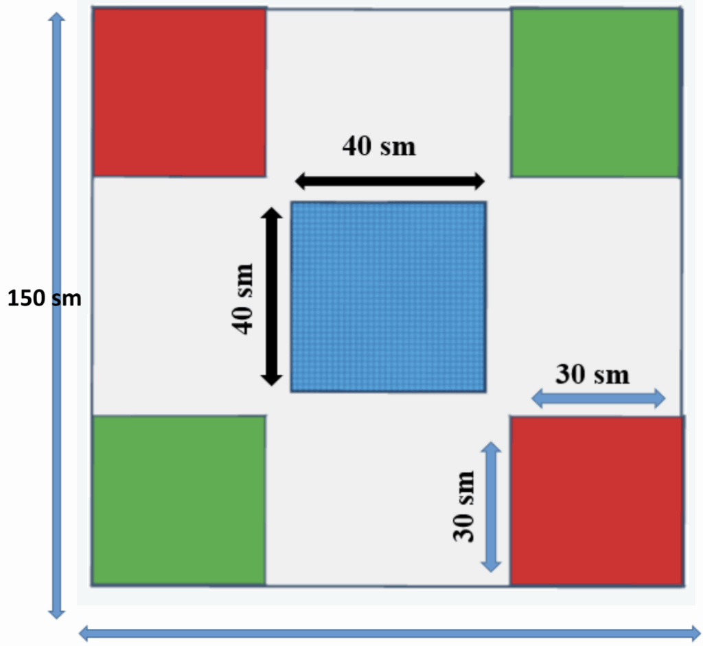 Ərazi tərəfləri 1.5m x 1.5m ölçüsündə olan kvadrat formadadır. Ərazinin mərkəzində 40sm x 40sm ölçülərində kvadrat formalı bir boşluq yerləşir.